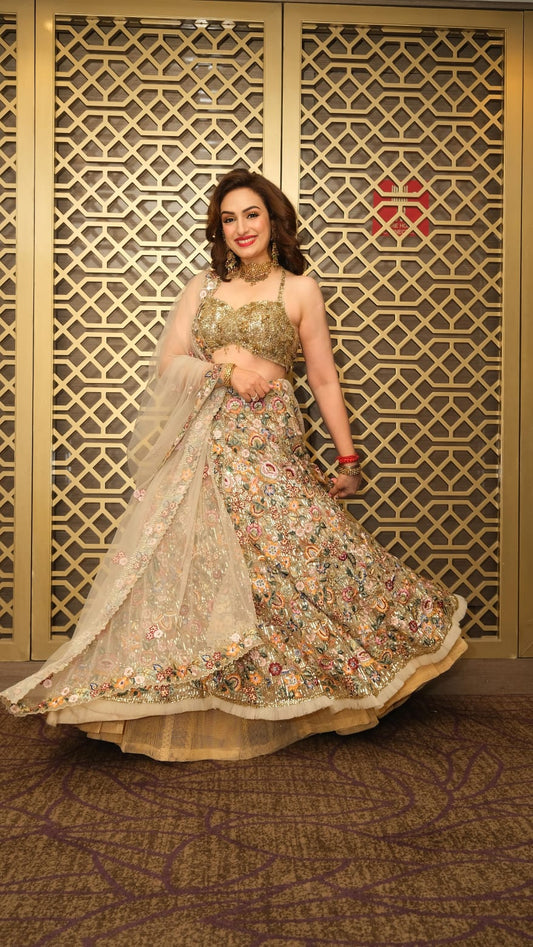 Mauve Taupe Pleated Skirt with Embroidered Blouse