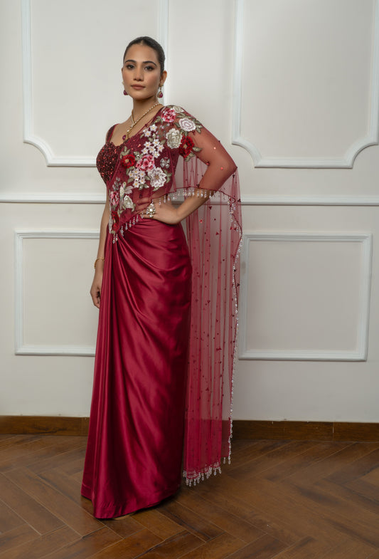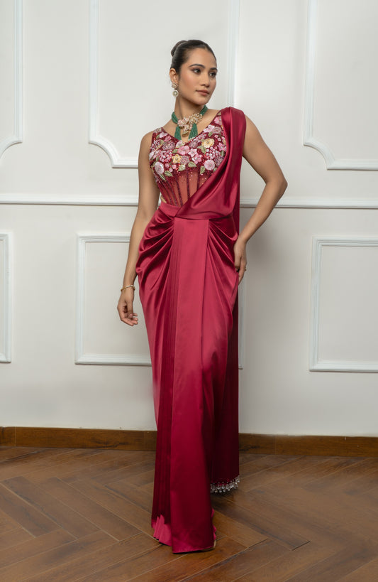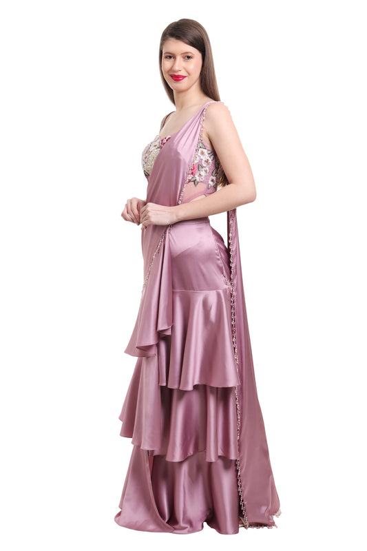 Mauve pre draped ruffle saree with embroidered bodysuit