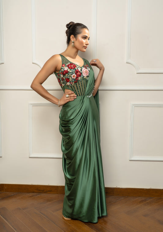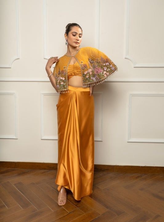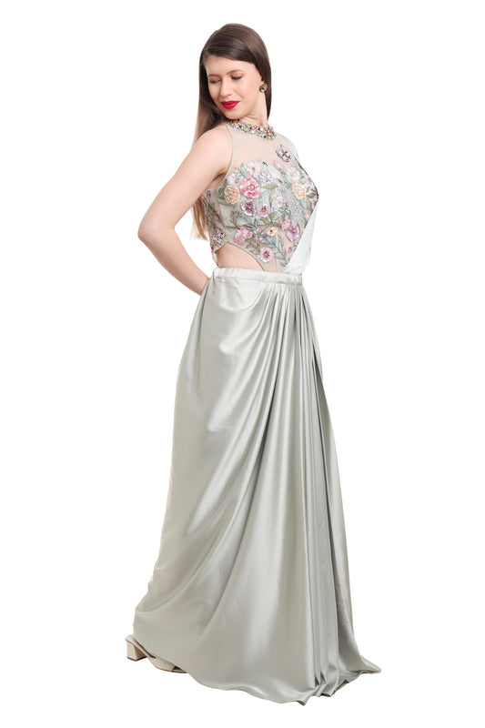 Misty jade green draped skirt with corset blouse and embroidered cape