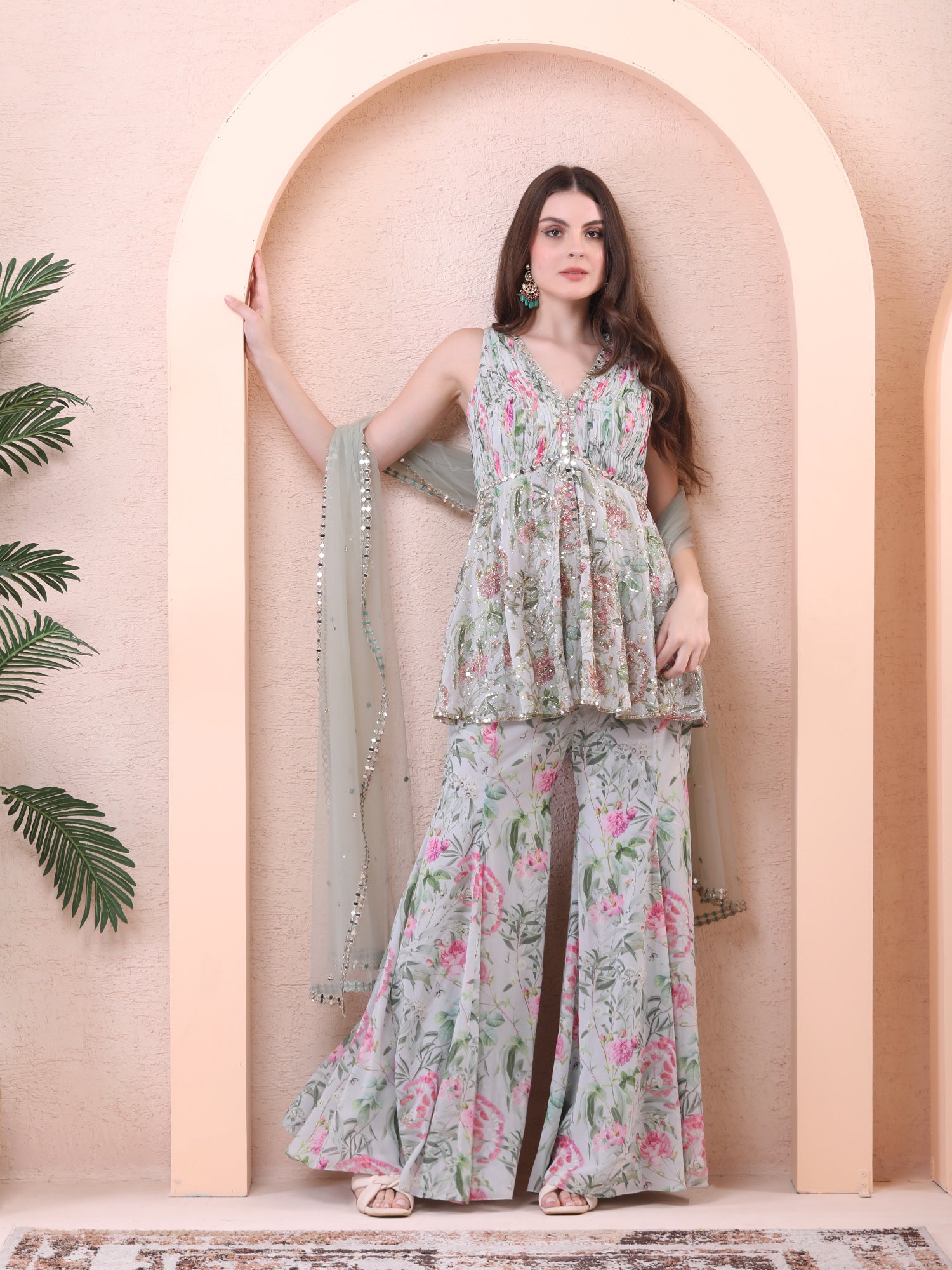 Green Georgette, Net Sequins, Embroidery V-neck Floral Print Kurta Sharara Set