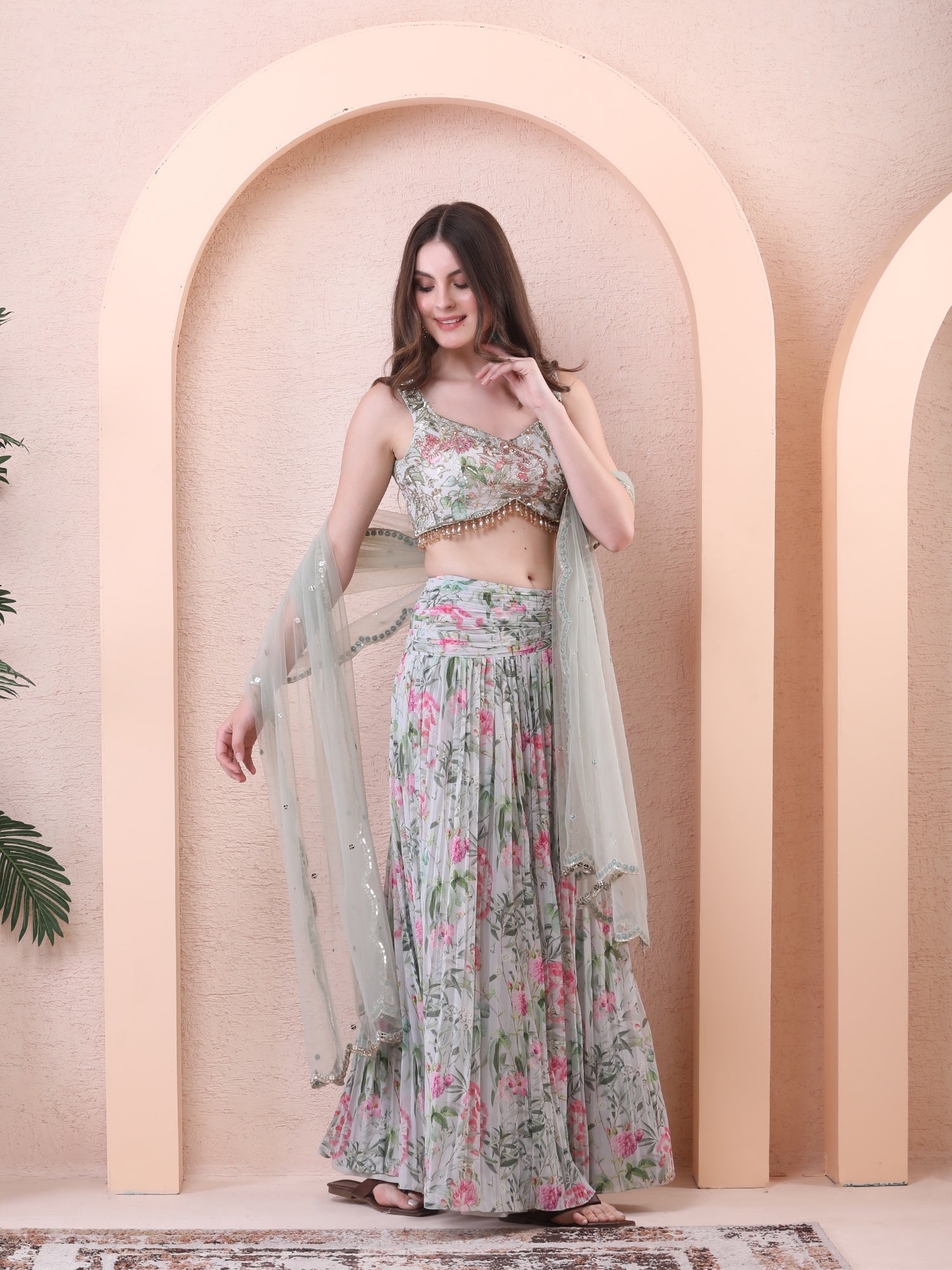 Green Georgette, Net Beads, Embroidery, Mirrors Floral Blouse Skirt Set