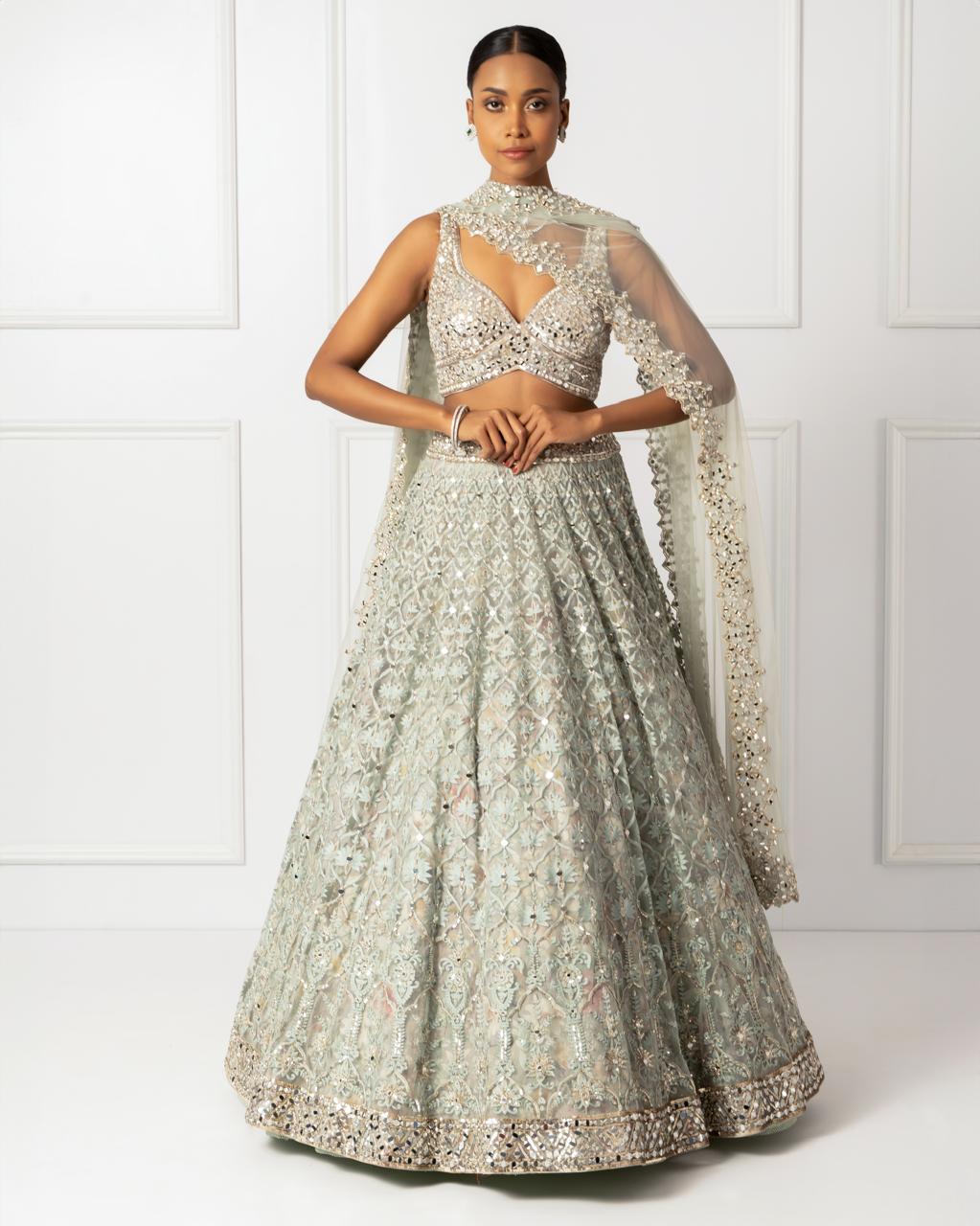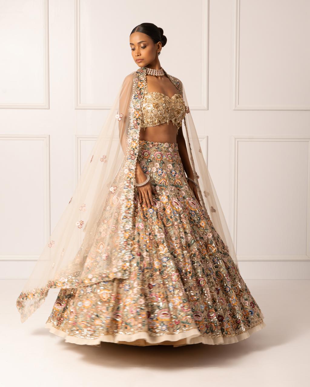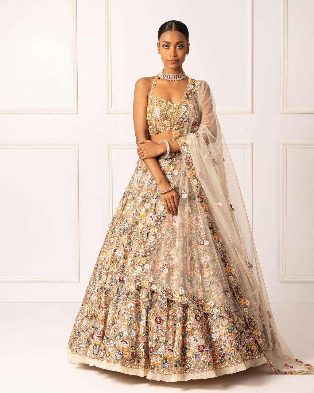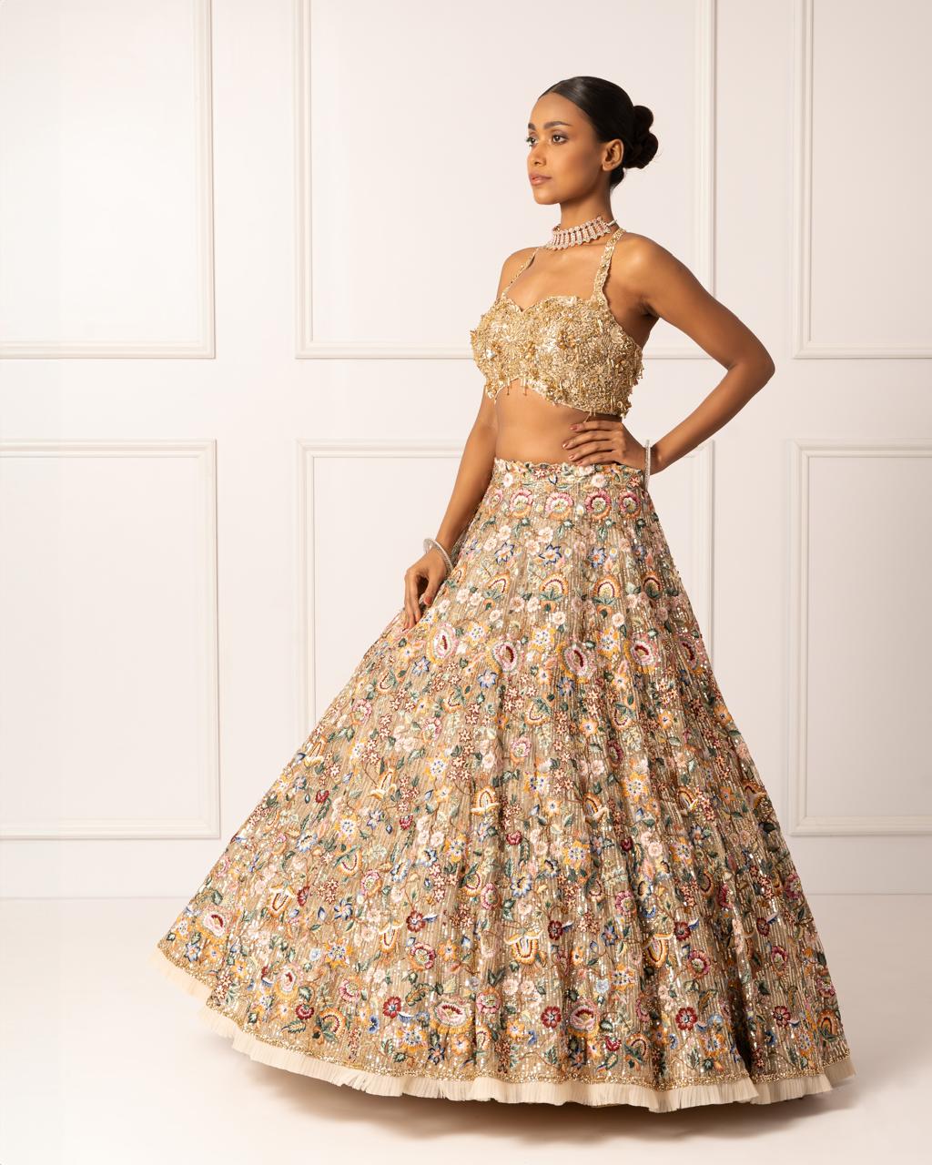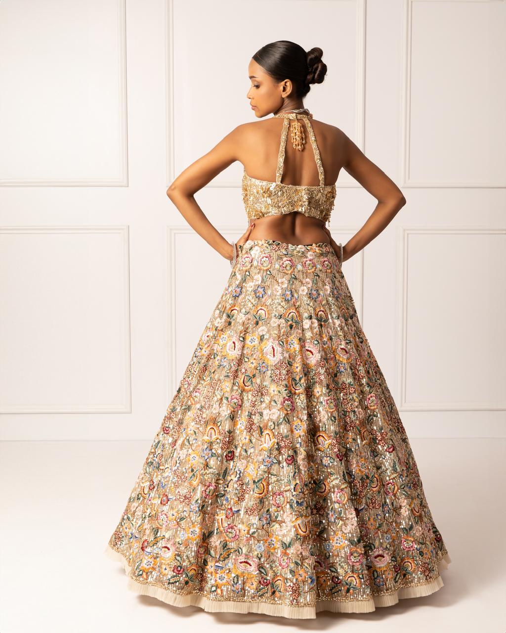 Multicolor floral sequins Embroidered lehenga set paired with golden 3D blouse and matching dupatta